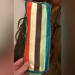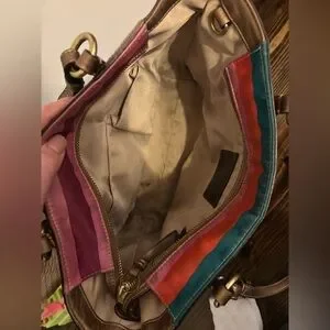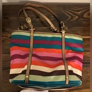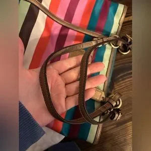 Chic Coach tote with vibrant stripes. Features adjustable straps and front pocket. Ideal for everyday use.