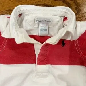 Classic adorable striped one piece. Features red and white colors, with a small faint stain on the bottom front white stripe. Polo collar with button placket. Soft and comfortable fabric. VERY cute.