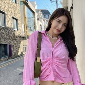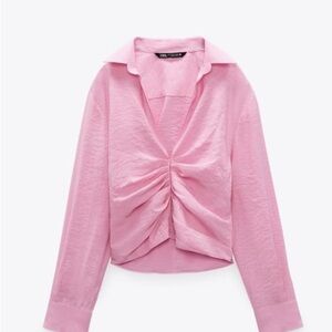 Zara Pink Ruched Long Sleeve Button Down Shirt