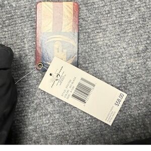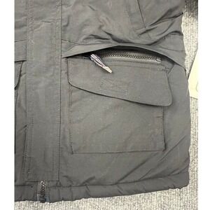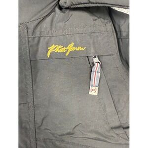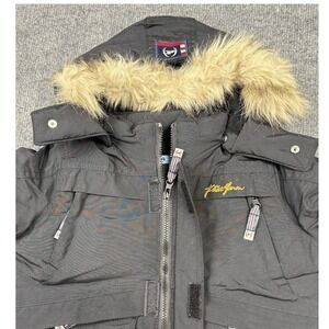 Vintage Phat Farm boys winter puffer jacket in black with a detachable fur-lined hood. Size 6-12 months. This stylish and warm jacket features a full zip front closure, multiple exterior pockets with zip and Velcro fastenings, and a subtle embroidered Phat Farm logo on the chest. The interior is lined for added warmth. Y2K, New with tags.