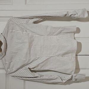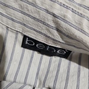 bebe blouse, striped button down, women’s medium top, fitted blouse, ruched sleeve top, chic workwear, modern office style, y2k fashion, tailored shirt, minimalist wardrobe