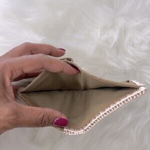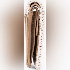 A braided woven trim decorates the edges of this slim leather wallet that has the perfect amount of space for your cards, cash and coins. Interior features card slots, change purse, bill compartment