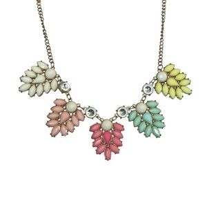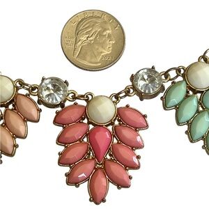 Add a fun pop of color to your outfit with this playful vintage statement necklace, likely from the late 1990s or Y2K era. The necklace features clusters of marquise-shaped pastel resin stones in shades of white, peach, pink, mint, and yellow, accented with small round rhinestones and set in gold-tone metal. The adjustable lobster clasp closure allows for a drop between 8 and 9 inches, making it versatile for various necklines.