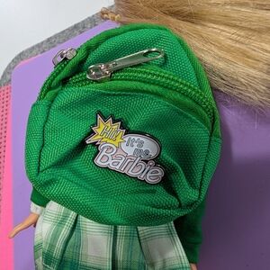 Surf Barbie is now a University student! Restyled in a green plaid pleated skirt with a Kelly green hoodie, white knee socks and black high top sneakers. Her matching green backpack has a Barbie comic brooch pinned to it. Her look is completed with white horn rimmed glasses and a white wristwatch.