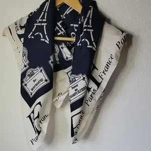 Stylish scarf featuring Paris-themed designs in blue and cream . Perfect for adding a chic touch to any outfit.