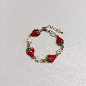 Playful bracelet featuring red strawberries and white flowers. Gold chain adds a touch of elegance. Ideal for any outfit.