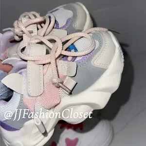 This set of kids shoes includes a pair of cream boots with bows, white sneakers with pink accents, and beige sneakers with pink and blue details. Perfect for adding style to any outfit