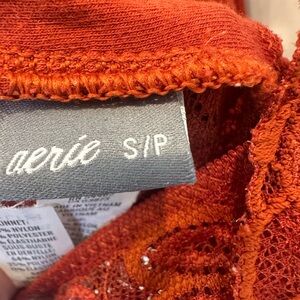 This beautiful Aerie bralette is a size small and in excellent condition. It features a lovely rust orange color, all-over lace design, and a comfortable V-neck front with a racerback strap detail. Perfect for layering or casual wear.