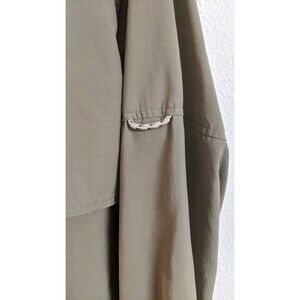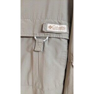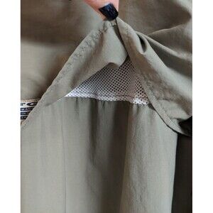 This Men's PFG Columbia Performance Fishing Gear Long Sleeve Vented Sports Shirt in size Medium is perfect for outdoor activities such as fishing, travel, or casual wear. The shirt features a collared neckline with a button-down style, made of lightweight and breathable nylon fabric with UV protection. It has a solid green color and embroidered accents, suitable for all seasons and designed for comfort and convenience with pockets and a packable design. Perfect for men who enjoy a day out in nature or on the water, this Columbia shirt combines style and functionality.