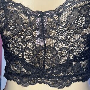 Stylish black crop top with white heart pattern. Features delicate lace trim and thin straps.