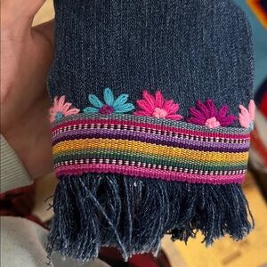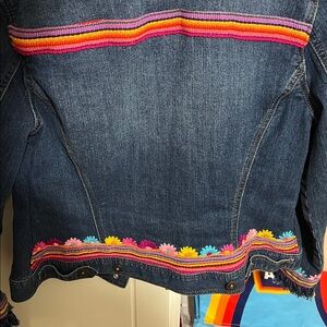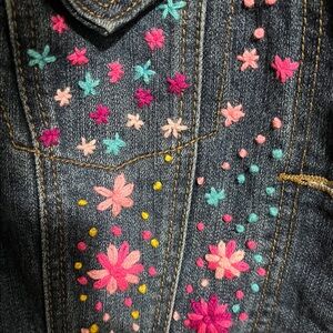 Stylish denim jacket featuring vibrant floral embroidery. Perfect for adding a pop of color to your wardrobe.