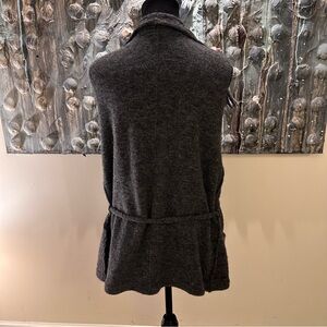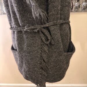 Stylish dark gray vest with fringe detail. Perfect for layering. Enhances any outfit. Beautiful condition I purchased at a thrift store for $50 as a gift and didn’t end up giving something else. I have not washed it. It still has the spare wool tag attached which leads me to believe it’s new.