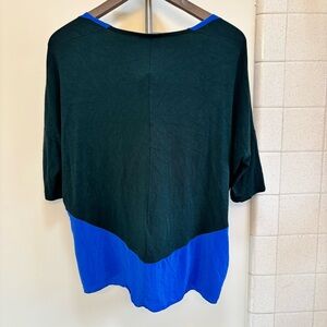 Hell, love! The lightweight vintage top is silk (blue part) and rayon blend (green part). Elegant blouse with a royal blue front and forest green sleeves. Ideal for versatile styling. Looks like something you would buy from Quince. Made in USA. Dry Clean Only. Xox