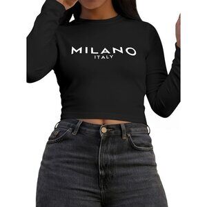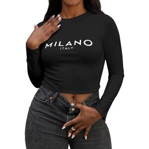 Features: Fitted, cropped long sleeve top with a bold letter graphic print. Soft, stretchy fabric that feels comfy against the skin, keeping you warm on cooler days. Crew neck and a sleek, snug fit make it a stylish choice for any casual outing.