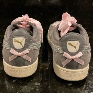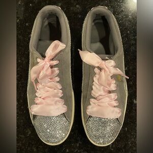 PUMA Classic Suede Trainers women’s Size 9 with SWAVORSKI stones and Pink satin ribbon laces. Quality stones for a beautiful sparkle! Woman’s size 9, some signs of wear but in good condition!