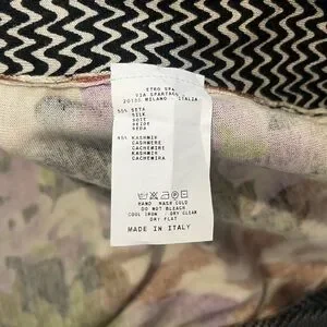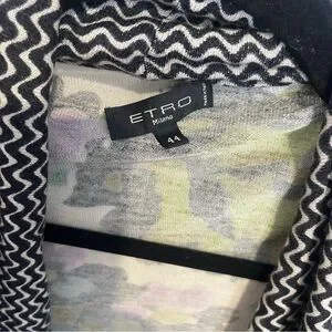 The ETRO Silk & Cashmere Open Front Cardigan Duster in a floral paisley pattern is a luxurious and stylish addition to any wardrobe. Made in Italy, this tight-knit sweater features a shawl neckline and long sleeves, perfect for a casual occasion.