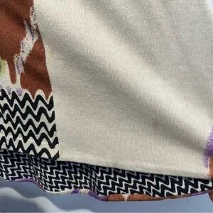 See photos for details - there's 2 small pinholes and some discoloration on part of the beige cardigan.