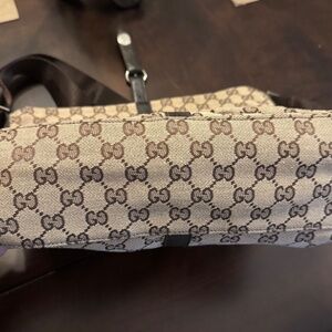 Authentic Gucci GG monogram canvas messenger bag in classic brown with leather trim and adjustable shoulder strap.