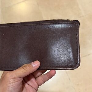 Sleek brown leather wallet with zipper closure. Ideal for everyday use.