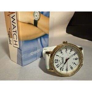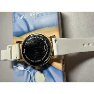 Featuring a gold bezel and white silicone band, this watch is both functional and fashionable. The crystal dial adds a touch of elegance, while the analog display ensures accurate timekeeping. With its 38mm case size and medical-grade materials, this watch is durable and reliable for use in various healthcare settings. Plus, it comes with its original box and packaging, making it a great gift option for those working in the medical field.