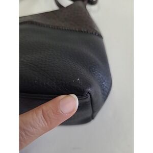 This purse is in great condition. Has a tiny stain on the corner, tiny leather fading in the bottom corner. It's between a small and medium size. The hardware had peeling silver paint. The inside leather pocket has tiny stain. Please see measurements and photos before purchasing.