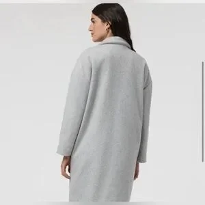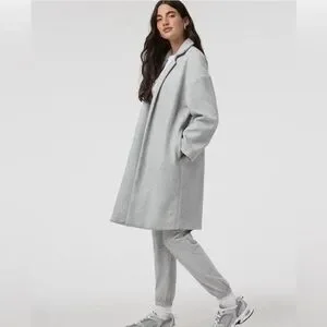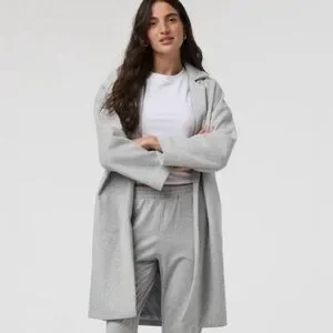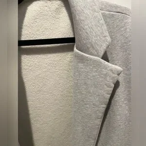 Vuori Trench Blazer Coat Size XS/S. tag has beenn removed for comfort. This has only been worn twice and in excellent condition. color is gray. Please note the pockets are stitched in with two string on each side. The pockets may lay better if steamed or if the two strings are cut. I do not have a problem with pockets lying flat on me - just depends on your body type. See last photo for pockets and please ask questions before purchase.