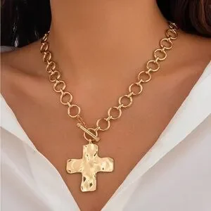 Notable Hammered Cross Front Toggle Necklace is a bold and elegant statement piece with a touch of artisanal charm. Featuring a striking hammered cross pendant, this necklace showcases a textured, handcrafted look that adds depth and uniqueness. The front toggle closure not only ensures easy wear but also enhances the design with a modern touch. Product details length: 18" clasp: Toggle metal finish: Gold Plated product: Lead & Nickel Compliant anti-tarnish: Double E-coating