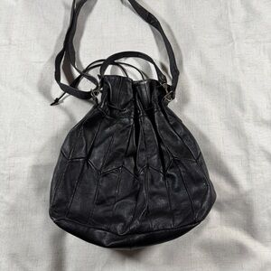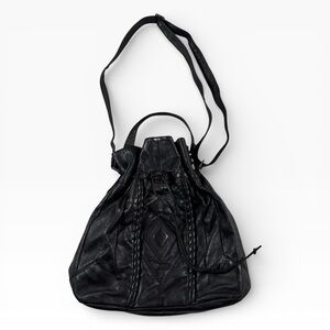 This vintage black leather purse has a slouchy silhouette and a soft texture. It displays vertical braided accents and a diamond patch on the front. The top cinches with a leather drawstring cord for a secure closure. It includes both a fixed top handle and a detachable shoulder strap for versatile wear. Inside you will find a paisley fabric lining and a small zip pocket.