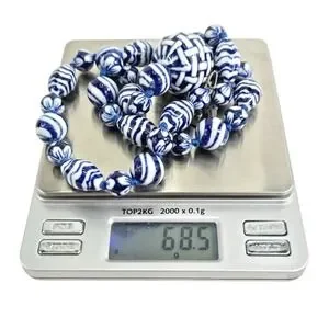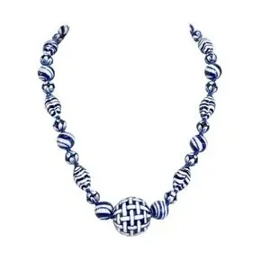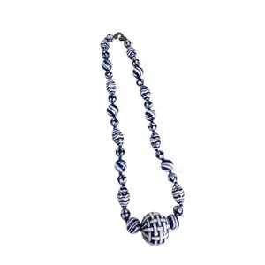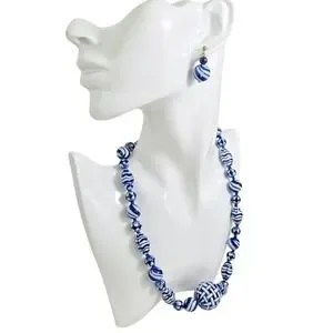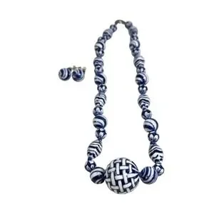 Blue Ceramic Porcelain Basket Weave Bead Necklace Earrings Set Coco 925