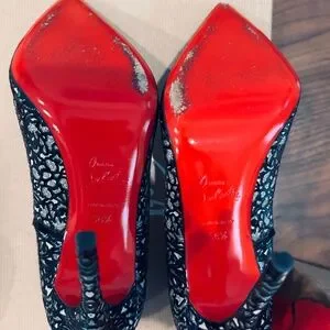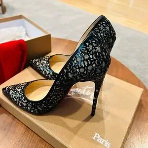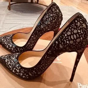 Elegant black cut lace design with high stiletto heel. So pretty 120 pattern with beautiful undertones that stands out but not flashy. Very good condition. Size 38.5.