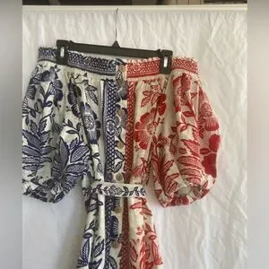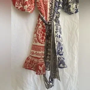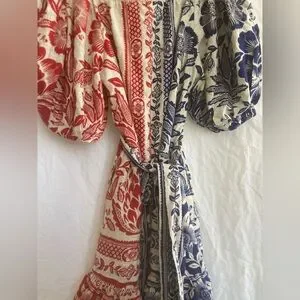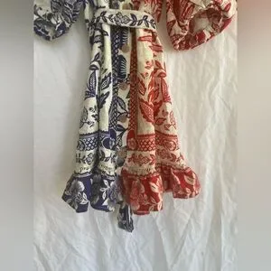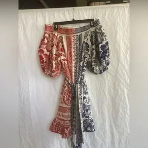 Stylish off-shoulder dress with floral patterns. Features vibrant blue and red colors. Perfect for a chic look.