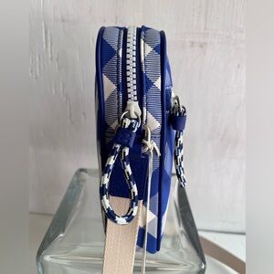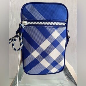 Burberry nylon twill compact crossbody bag woven with a check pattern and trimmed with smooth leather.