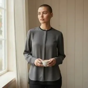 quiet luxury, minimalist blouse, Vince silk top, office chic, elevated basics, modern workwear, longline tunic, gray silk shirt, architectural style, effortless luxe, capsule
