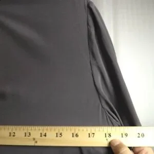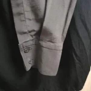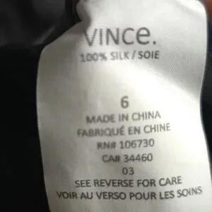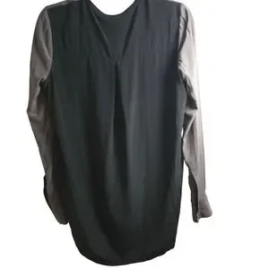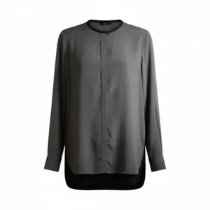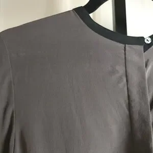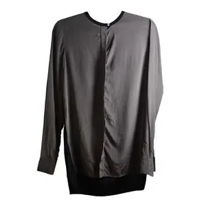 A refined Vince 100% silk longline blouse in a rich graphite gray with a minimalist, clean-lined silhouette and hidden front placket. Features a mixed-media black back panel for subtle contrast and modern drape. Effortless quiet luxury—perfect for workwear, elevated basics, or sleek winter layering. Size 6. Excellent condition.