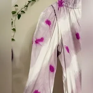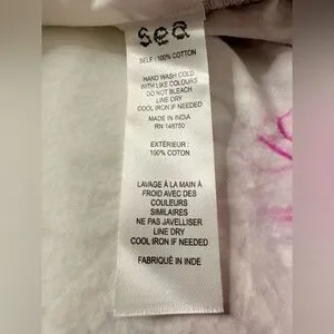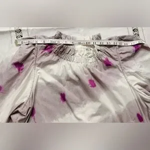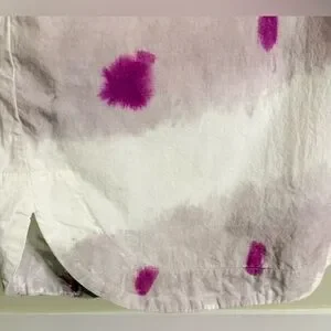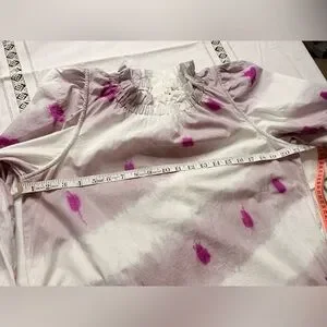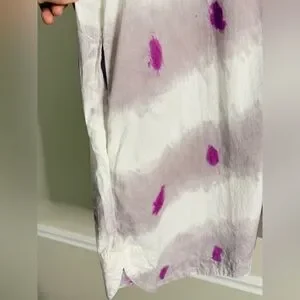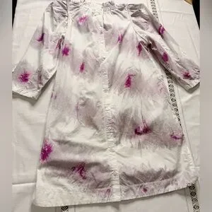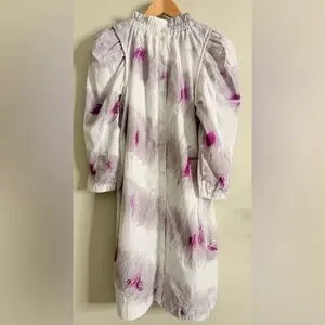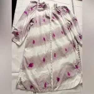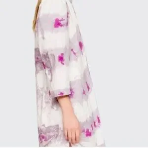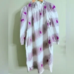 Elegant dress by Sea New York. Features a soft cream base with purple accents. Perfect for stylish outings. Our hand dyed Tamara tie dye 3 / 4 sleeve tunic features corded detailing, a high neck, puff sleeves and button back detailing. Hand dyed by a women's collective in India. Please note when it comes to hand dyed garments, color variation is a normal part of the process. No two are exactly alike.