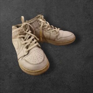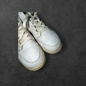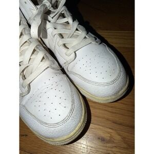 The Nike Air Jordan 1 Mid Shoes in Youth Size 7Y are a stylish and athletic option for kids. Made of leather with a solid white color, these lace-up sneakers feature a flat heel and the iconic Air Jordan branding. Designed for basketball performance, these shoes are part of the Air Jordan product line and offer both comfort and style for young sneaker enthusiasts. Perfect for casual wear or sporting activities, these Jordan 1 Mid Shoes are a versatile choice for any child.