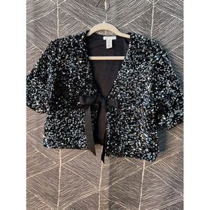 Keywords: sequin set, party outfit, black sequin jacket, mini skirt, cropped jacket, H&M, sparkly, glamorous, cocktail party, New Years Eve, festive, medium size, women's clothing, shiny outfit