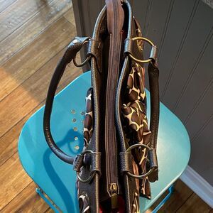 Elevate your style with this chic woven handbag. Featuring a sophisticated brown and black design, this bag is perfect for any occasion. The elegant bow detail adds a touch of flair.