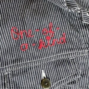 This is the most fun and unique stretch denim jean jacket! It’s made of a stretchy navy pinstripe denim and buttons up the front. It was a custom order from my small business that was never paid for and collected, so it’s brand new and totally one of a kind. The front is chain stitch embroidered with “One of a Kind” and has sparkle stars at the top. The back has a vintage elephant flour sack appliquéd on it. It is a Size Large. I just removed the tag when I customized it. 20.5” pit to pit with stretch, 21.5” length, 23.5” sleeves.