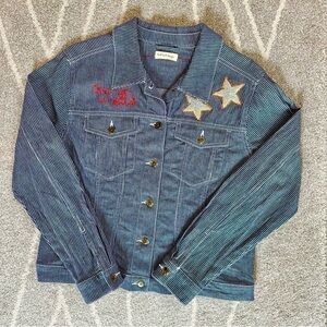Pinstripe Navy Stretch Jean Jacket w/ Embroidery & Elephant Flour Sack Applique