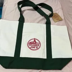 Trader joe’s green and white large tote bag with tags.
