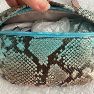 Michael Kors crossbody sling purse NWT exotic and colorful Ocean Blue Multi TRENDY Perfect lightweight Purse has built in safety feature the way the zipper closes across the top Strap is adjustable can be longer Bag is 9.5 inches across 4" deep and 4" wide MSRP $328