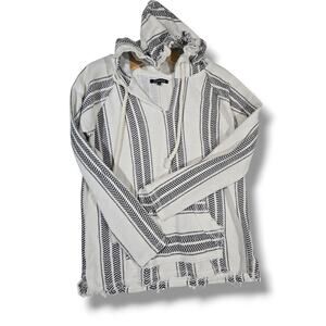 Cozy Ocean Drive hoodie featuring black and white Baja-style stripes with front kangaroo pocket and drawstring hood. Soft 90% cotton / 10% polyester blend for a relaxed beachy vibe. Gently used, in great condition—perfect for layering or cool evenings! 🖤🤍🌴