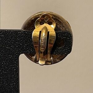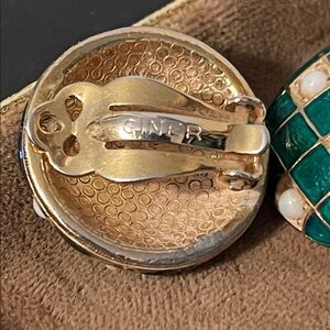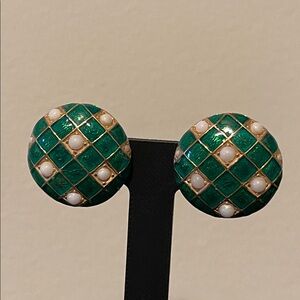 Stunning vintage Ciner clip-on earrings. They feature a bold, domed design with a green enamel checkerboard or crosshatch pattern and white accents (faux pearls) set in a gold-tone metal. Measure 1” in diameter with secure clips. Minor wear on backing of earrings otherwise in great vintage condition.