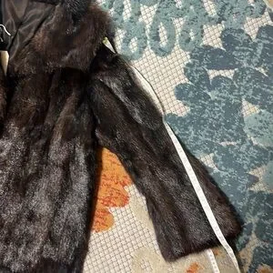 This is a gorgeous glossy dark espresso brown mink coat. The exterior is incredibly soft to the touch. It has been well kept, so the fur has held its color and shine. The interior is a brown fabric with black leather and a gold line trim. The lining is in good condition with no rips or tears or stains. There are two pockets with lining. There are three hook and eye fasteners. This coat is perfect for an elegant winter wardrobe.
