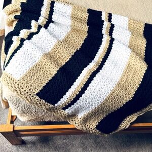 Beautiful handmade crochet afghan in a modern striped palette of tan, black, and white. Measures approximately 52" x 44". Soft, warm, and perfect as a lap throw, couch decor, or thoughtful handmade gift. New and never used. Clean, smoke-free home.