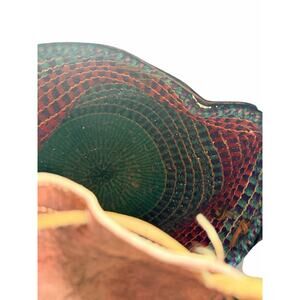 Handwoven artisan basket tote made from natural sisal fiber with genuine leather trim and long shoulder straps. Structured round base with a spacious interior and soft leather drawstring closure. Features an earthy multicolor weave with green, rust, purple, and natural tones—classic boho and festival style.