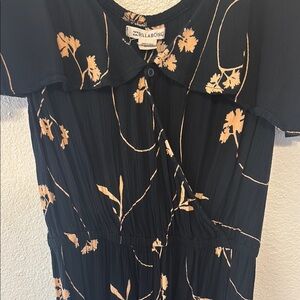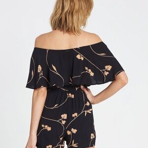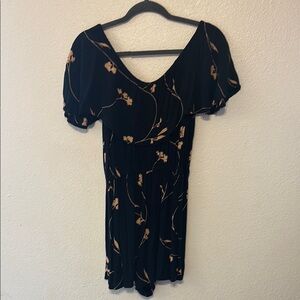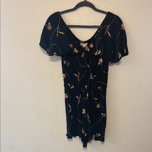 Stylish black romper with floral print. Features a flattering V-neck and ruffle sleeves.
