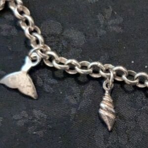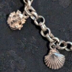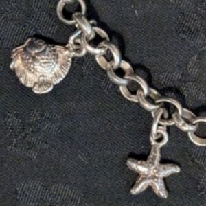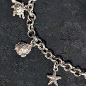 Elegant silver charm bracelet featuring a variety of unique sea creatures. Perfect for adding a touch of sophistication to any outfit. Charms include sea shells, fish, dolphin, whale's tale, turtle and star fish.