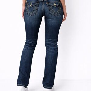 The Vintage True Religion Jeans Cameron Skull And Roses Distressed in size 28 are a stylish and unique pair of women's jeans. Made from 100% cotton with a dark wash, these jeans feature a button closure and a low rise. The design of the jeans showcases the brand's signature skull and rose detailing, adding a touch of edginess to the classic blue color. With a straight leg style and a 31-inch inseam, these jeans are both fashionable and versatile for everyday wear.